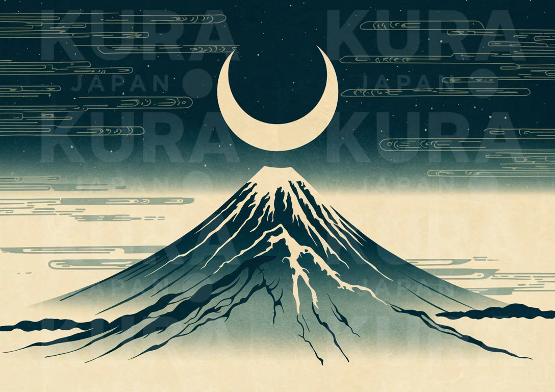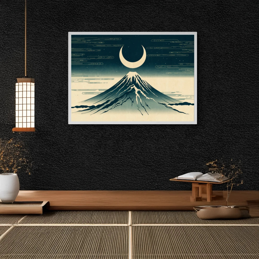 L’affiche Mont Fuji Lune s’inspire de la majesté du Mont Fuji, symbole intemporel du Japon et source d’inspiration pour les artistes depuis des siècles. Cet art illustre l’harmonie entre la nature et le temps, incarnée par le croissant de lune surplombant le sommet enneigé. Ce contraste subtil entre l’obscurité de la nuit et la sérénité du paysage rappelle l’esthétique wabi-sabi, célébrant la beauté de l’imperfection et de l’éphémère.