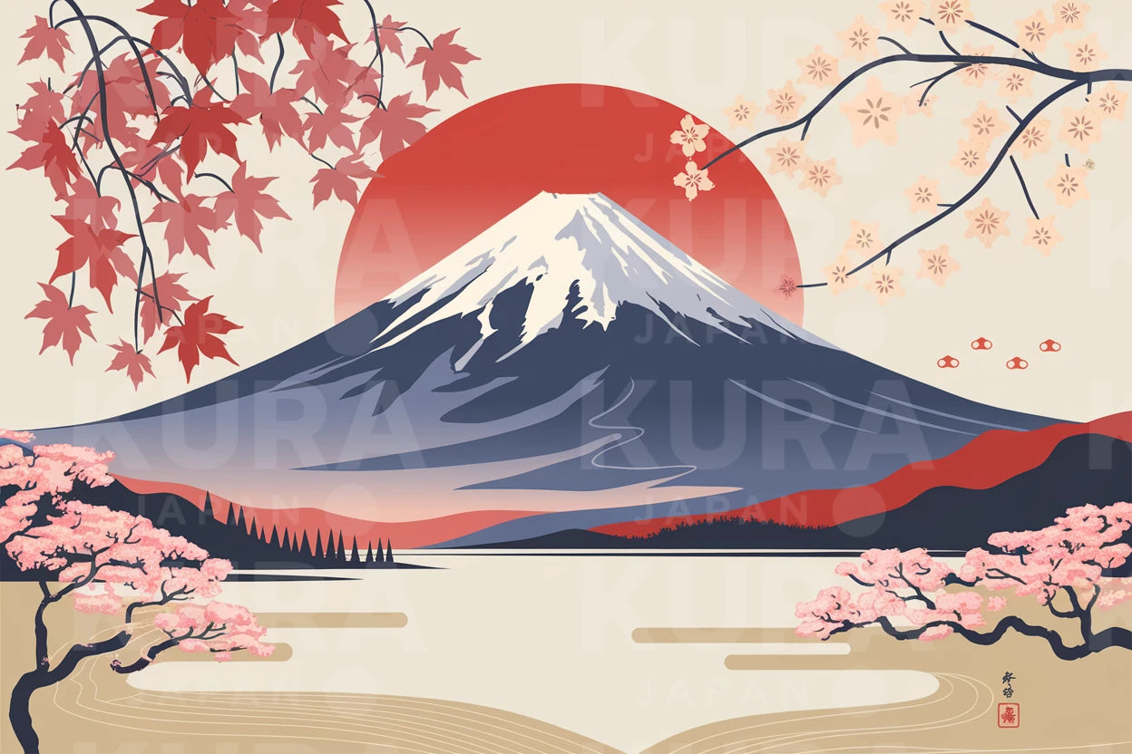Illustration Zen – Mont Fuji avec Soleil Levant et Cerisiers