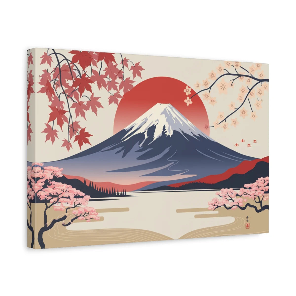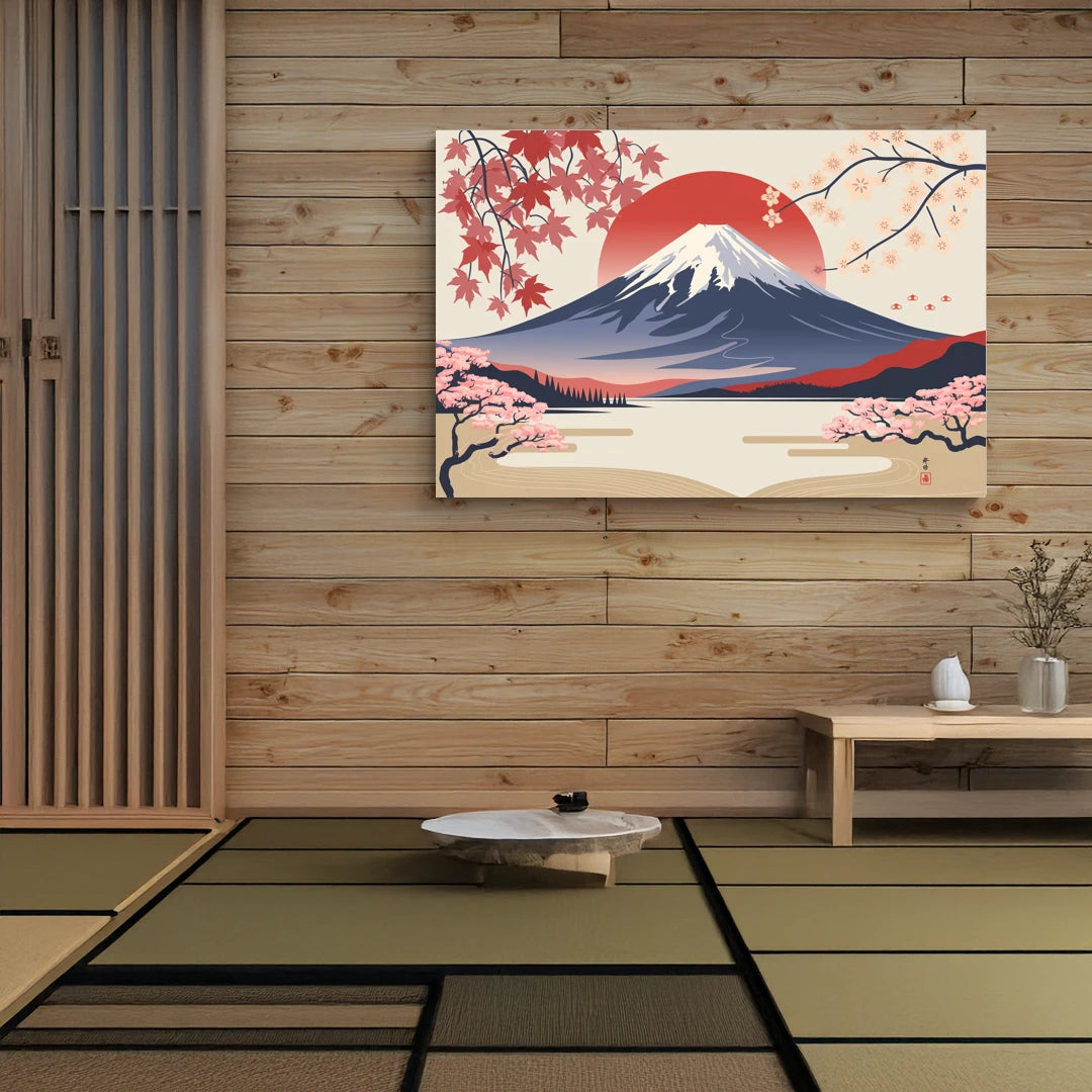 Ce tableau représente le Mont Fuji, une icône culturelle et spirituelle du Japon, entouré d’éléments emblématiques comme les cerisiers en fleurs et un soleil rougeoyant. Ces symboles rappellent la beauté éphémère des saisons et l’harmonie de la nature, des valeurs chères à l’art et à la philosophie japonaise. Inspiré par les paysages traditionnels et le style ukiyo-e, ce tableau est une invitation à voyager dans l’âme du Japon et à contempler sa sérénité intemporelle.